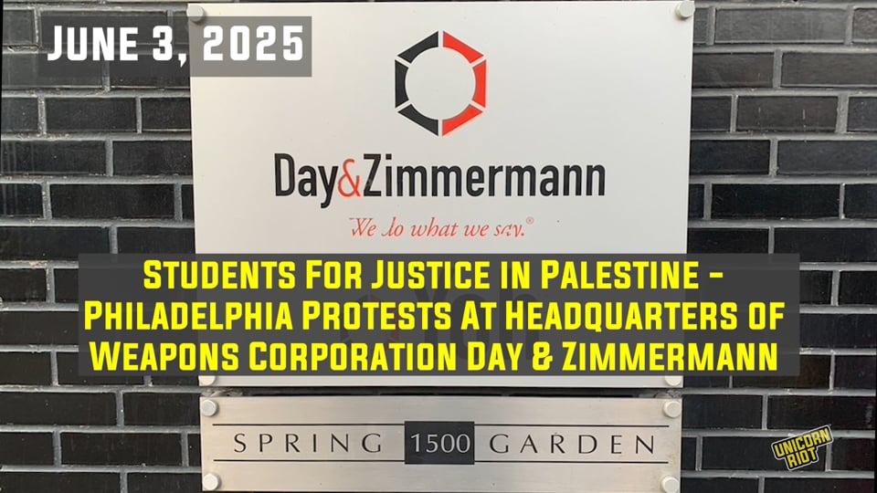 “Before long the entire city will know what this company does!” These were some of the last words spoken Tuesday morning by a protester with a megaphone and a kaffiyeh scarf after a few dozen people had gathered for two hours outside a well-appointed office building in Center City Philadelphia. Their target was Day & Zimmermann, a “construction, engineering, staffing and ammunition manufacture” company that makes shells and machine gun rounds used by Israel to kill Palestinians. Full story and more in links below.