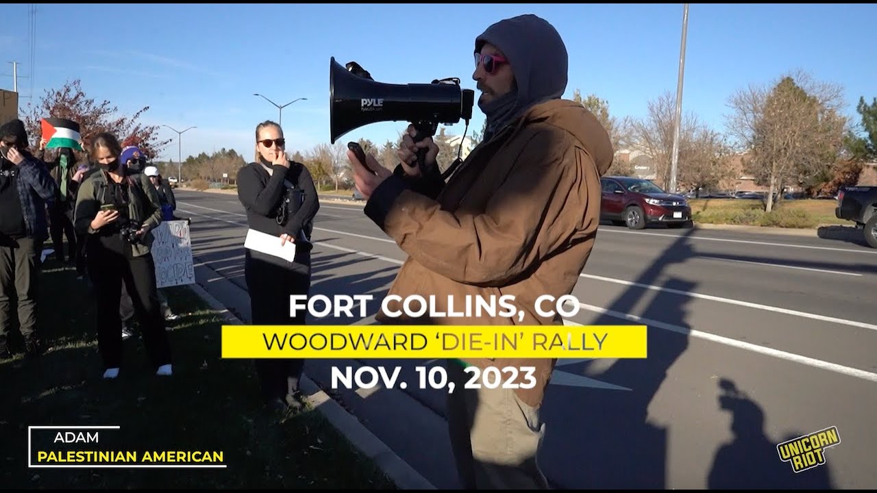 During a “die-in” demonstration outside of the national headquarters of Woodward, Inc. in Fort Collins, CO on Nov. 10, 2023, Adam, a local Palestinian American spoke to the hundreds of attendees about how Israel’s actions against Palestine are “not a war on terrorism,” and instead “a war on toddlers.”