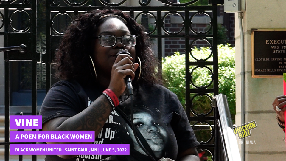 An all-Black-women lineup of speakers and performers gathered outside the Minnesota Governor’s Residence to remember Breonna Taylor on what would’ve been her 29th birthday had she not been killed by Louisville police over two years ago. Of the several speakers, Vine was one of three who performed spoken word pieces. She performed a newly written piece, “Hey Black girl to Black woman…” Watch the other two here along with a video from the whole event: unicornriot.ninja/2022/black-women-united/