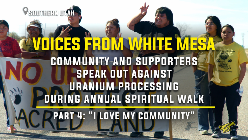 This video is Part Four of our four-part series “Voices from White Mesa.” On Oct. 12, members of the Ute Mountain Ute Tribe held their annual spiritual walk opposing the White Mesa Uranium Mill in Southern Utah. The mill, which processes uranium and other substances, sits on sacred land just north of the tribeβs reservation boundary and is the only one of its kind in the U.S. Local organizers with White Mesa Concerned Community and their supporters organize the walk each year to raise awareness about the mill and demand it be shut down and cleaned up. Participants rallied before walking five miles to the mill site. Unicorn Riot heard from participants and organizers along the route. Full story and videos in link below.