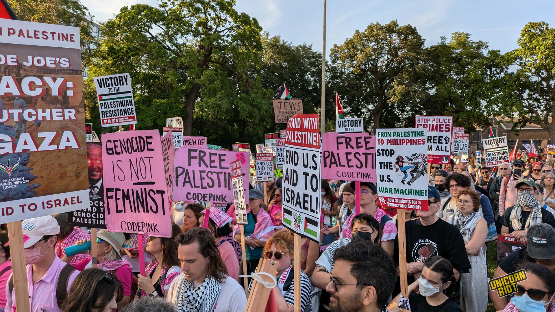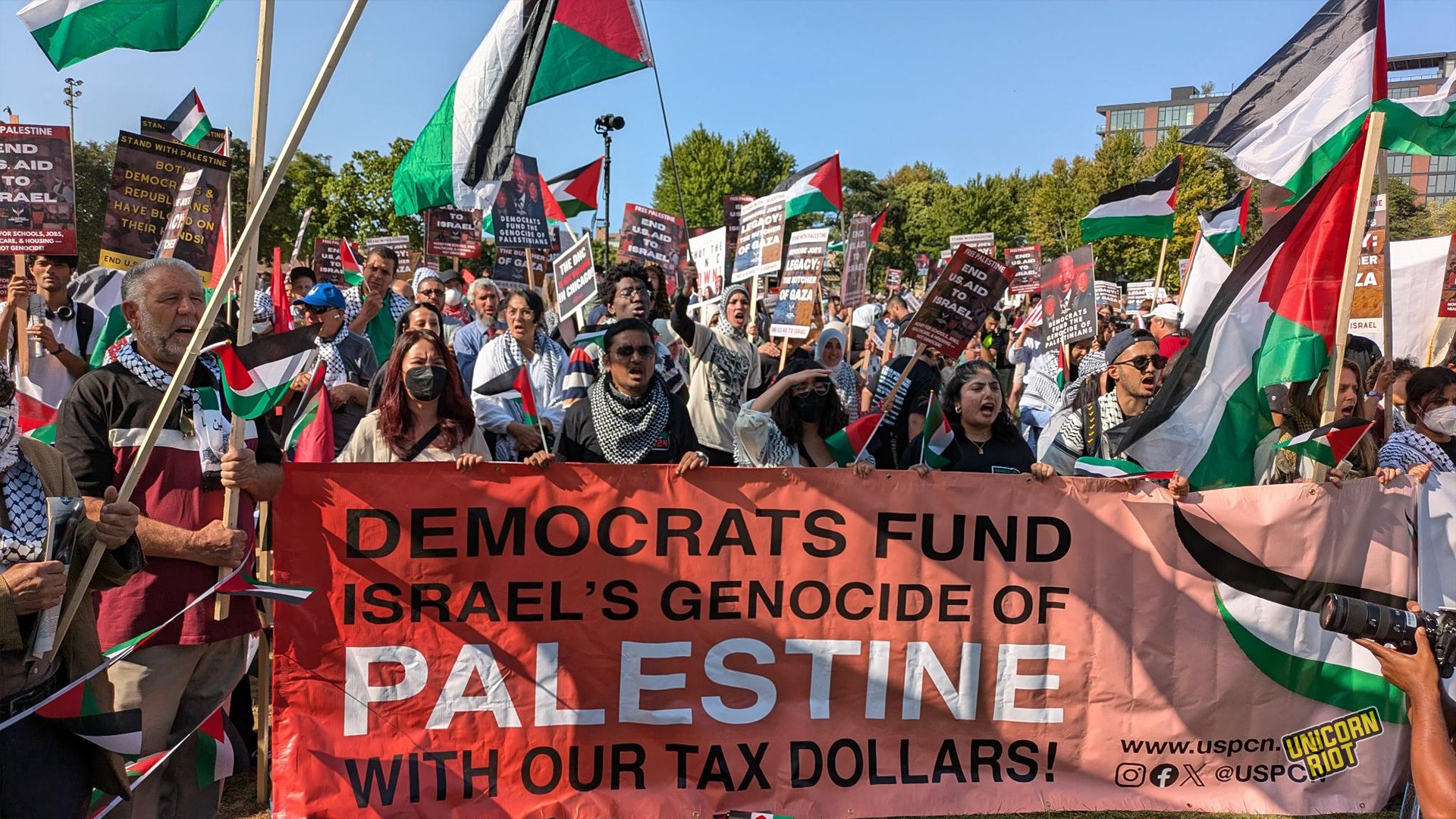 Chicago, IL — On the last day of the 2024 Democratic National Convention, protests are continuing at Union Park to oppose the DNC and shed light on the U.S.-funded ongoing violent occupation of Palestine by Israel.