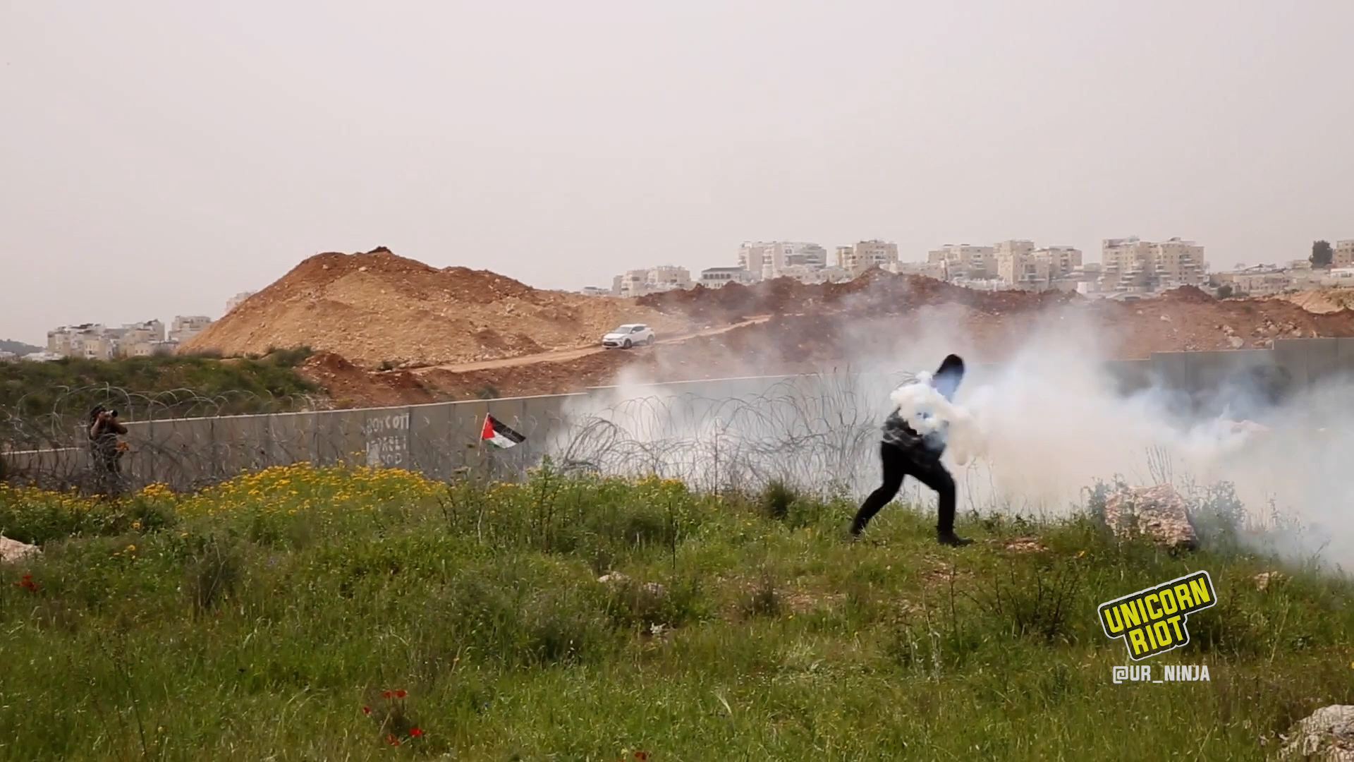 Bil’in village, Occupied West Bank, Palestine – A young man was shot with live ammunition by Israeli forces during a Land Day march along the wall separating the Palestinian village of Bil’in and Israeli colony settlements. Israeli forces targeted the marchers with live bullets, sound…